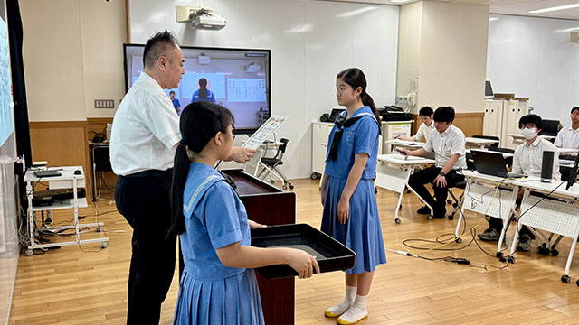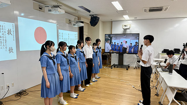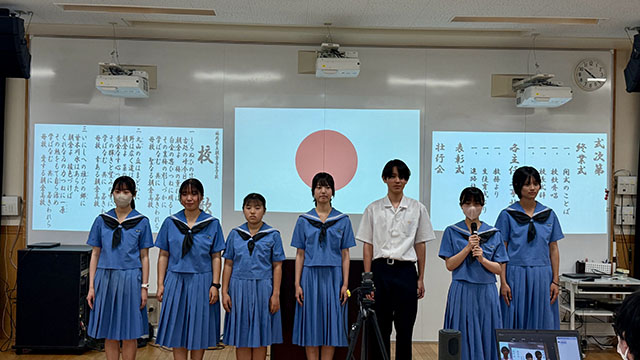7月18日(金)、1学期終業式と表彰式・壮行会が行われました。連日の猛暑続きのため、会議室よりリモート配信で実施しました。 表彰式では、水泳部の九州大会の栄誉を讃え、壮行会では九州大会に出場する陸上部、全国高校総文祭に出場する音楽部へエールが送られました。