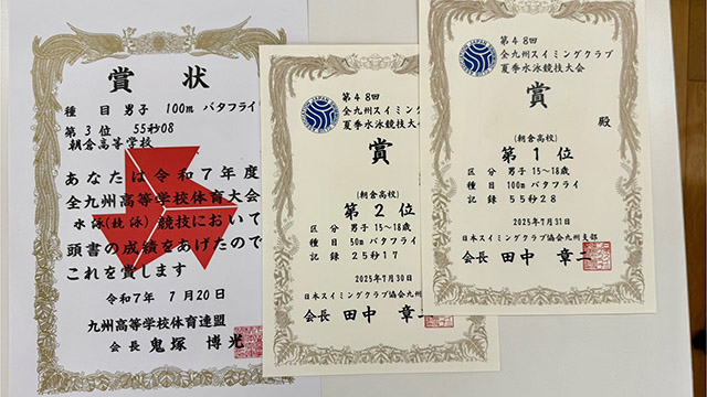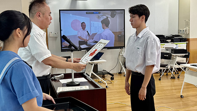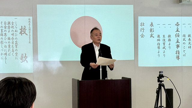 8月22日(金)、残暑厳しい中での2学期スタートとなり、今回も会議室よりリモートで始業式を行いました。 校長式辞では、信頼できる人への相談の大切さや、体育祭に向けての準備・チャレンジ・他者との協力、学習面でも大切な2学期であるとして、文武両道を期待していることを伝えられました。 表彰式では、九州大会で見事な成績を残し、インターハイへ出場した選手へ賞状が手渡されました。また、この結果を受け、9月に滋賀県で行われる国民スポーツ大会へ福岡県代表としての出場が決定しています。
