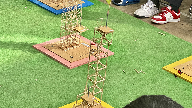 ルールは、30cm四方の台座につまようじと木工用ボンドだけを使って制作したタワーを固定し、振動を加えながら徐々におもりを追加し、最後まで倒れなかったら優勝です。耐震性を競う大会で、しっかりと原型を保ったまま学校へと戻ってきました。