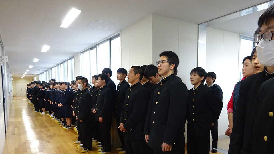 新型コロナウイルスの影響により、予定していた予餞会が中止となってしまいました。それでも、三年生を送り出したいということで、三年生最後の日に、サプライズで、廊下や別棟から教室に向かって歌いました。三年生は驚いた様子でしたが、近くで歌ってくれる後輩たちの思いに感動した様子でした。