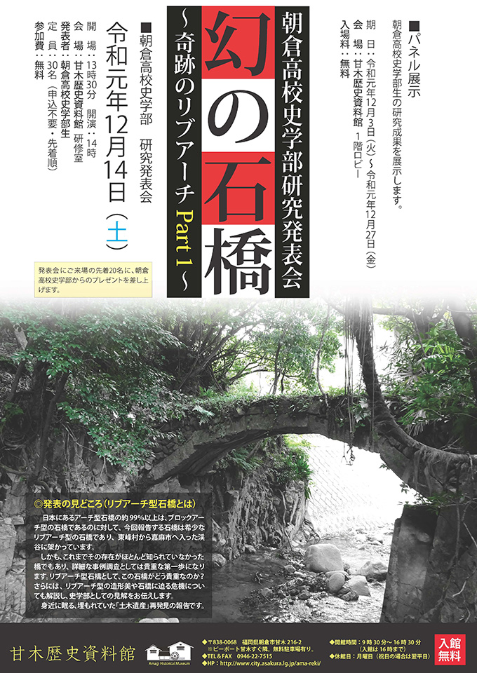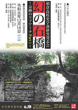 新体制となった史学部が、「地域に眠る文化遺産/土木遺産」をテーマに、嘉麻市旧秋月藩領の山中に眠っていた石橋について甘木歴史資料館にて研究発表会を行いました。