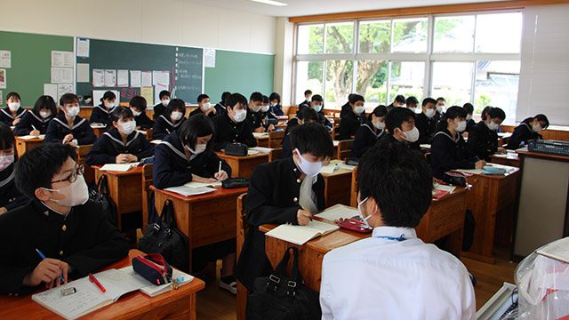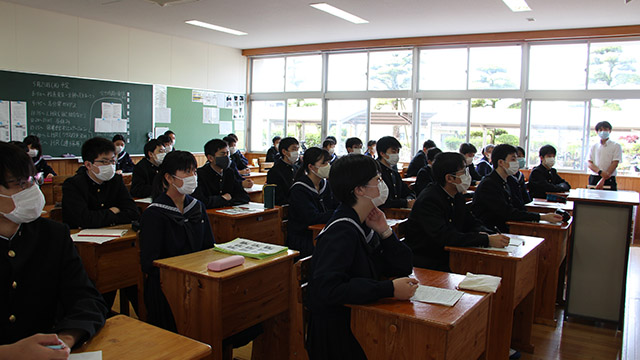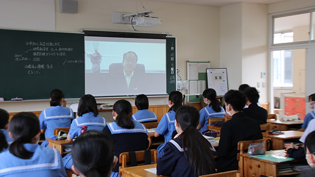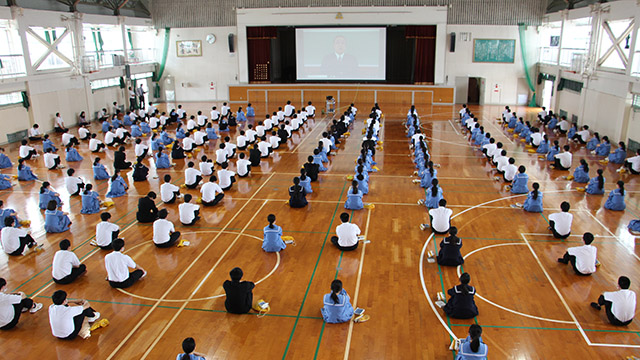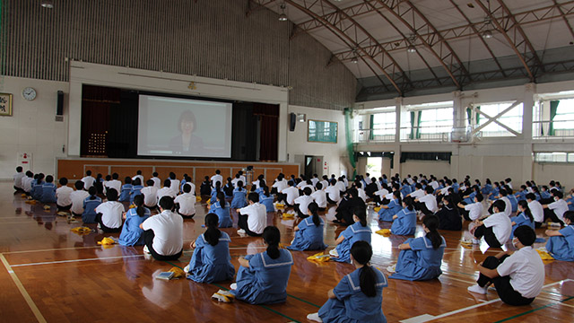 1限目のHRでは、全教室に設置してある電子黒板を利用して、学校長・各主幹教諭・転任してこられた先生方の挨拶などを動画にて紹介しました。校長先生から生徒の皆さんへのお願いとして『今を大切に!』という言葉を掲げられ、自分達の状況をしっかり見据えて日々の生活を送ってほしいと話がありました。