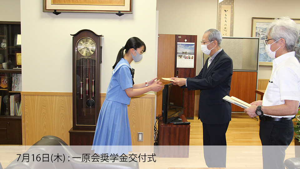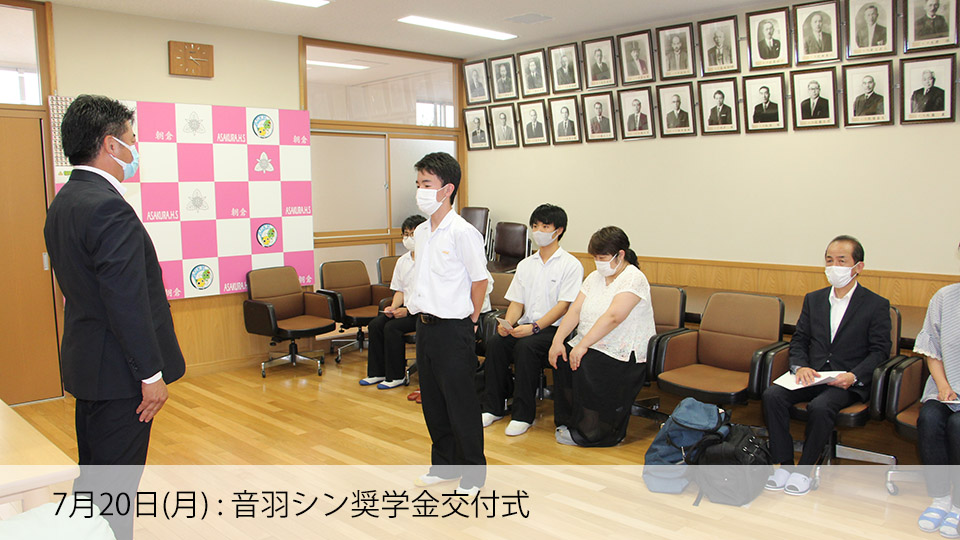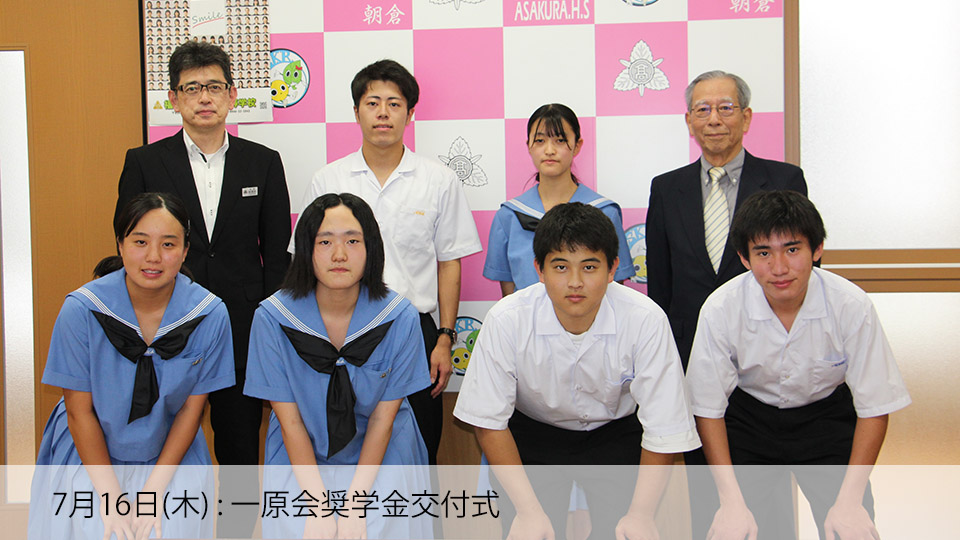 本校は、学校独自の奨学金制度が二つあります。 一つは、一般財団法人一原会様(本校同窓会)からの『一原会奨学金』、もう一つは、音羽シン様(朝女29回卒)からの『後援会音羽シン奨学金』です。 どちらも、朝高OBの方々からの母校愛の意志を受け、学業成績や生活態度・行動が本校生徒の模範となり、将来、良識ある社会人としての活躍が見込まれる生徒に授与されます。 OBの方々の期待に応えられるよう、皆さんのますますの活躍を応援しています!