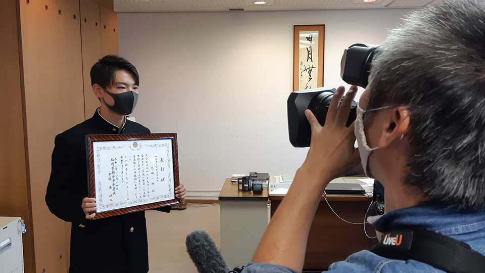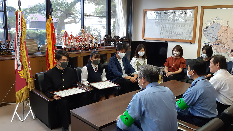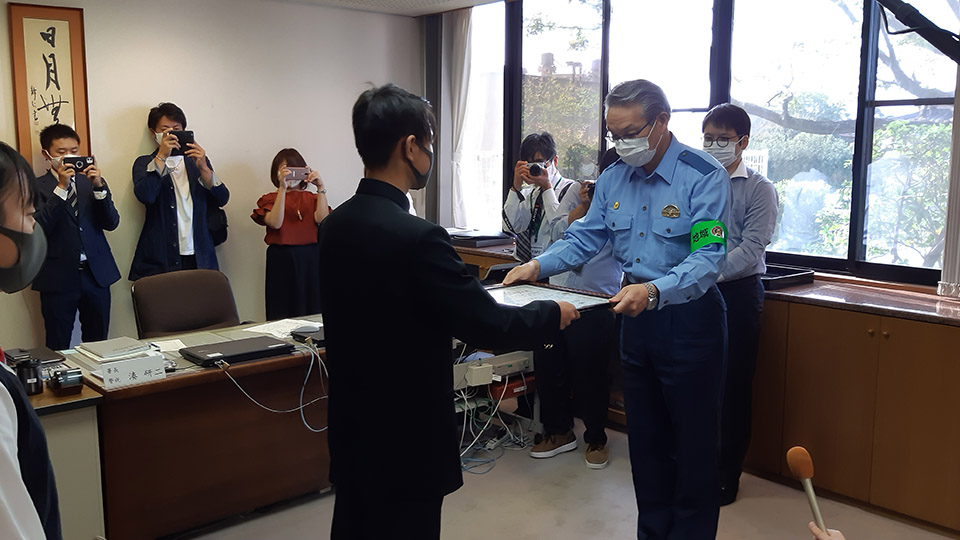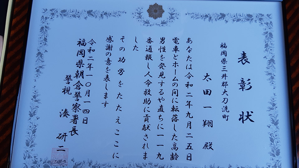高齢男性の救助に貢献したとして、朝倉署にて表彰状が贈られ、朝倉署の湊署長より「とっさの判断と行動は素晴らしいの一言に尽きる」とお褒めの言葉をいただきました。