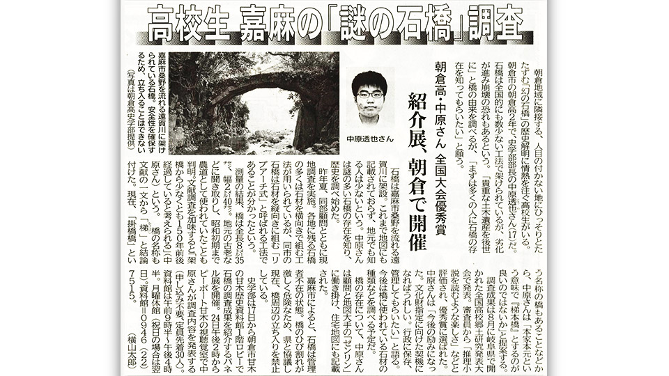 昨年6月より嘉麻市にあるアーチ型石橋を調査している史学部の活動が、今度は西日本新聞に掲載されました。 主な内容は8月の全国高等学校郷土研究発表会で「優秀賞」を受賞したことと、24日にピーポート甘木で開催される史学部研究発表会で発表する内容の紹介となっています。 当日は、石橋に関係する大学教授や議員さんも来場される予定との連絡が入っており、緊張感が高まりますが、しっかりと発表を行いたいと思います。