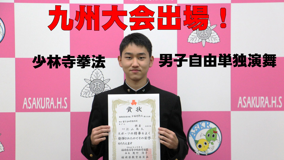 令和2年11月8日(日)に行われた令和2年度福岡県高等学校少林寺拳法新人大会において、本校1年杉山奏太くん(十文字中出身)が男子自由単独演舞にて見事1位に輝きました。 12月中旬に、いちき串木野市総合体育館(鹿児島県)で開催される九州選抜大会に福岡県代表として出場します。 皆さん応援よろしくお願いします!
