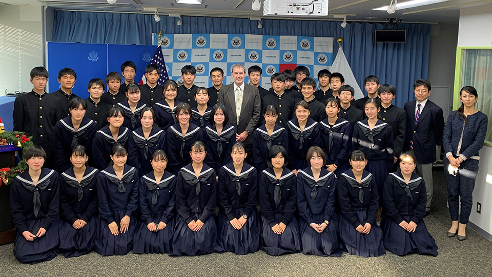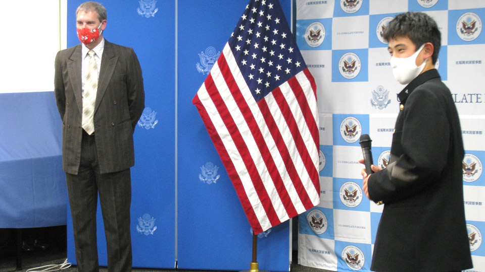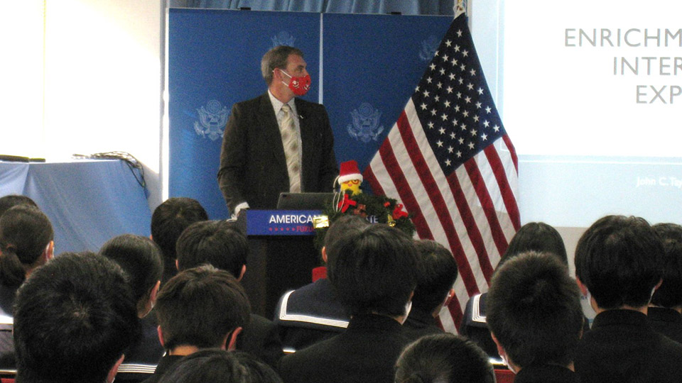 その後、米国首席領事のジョン・C・テイラー氏との懇談です。ご自身のルーツから現在までの人生を語られる中で、国際社会の問題点やアメリカの選挙の話など、他ではなかなか聞くことのできないお話を聞かせていただきました。生徒からの質問は具体的で鋭いものが多かったのですが、どの質問にも丁寧にお答えいただきました。