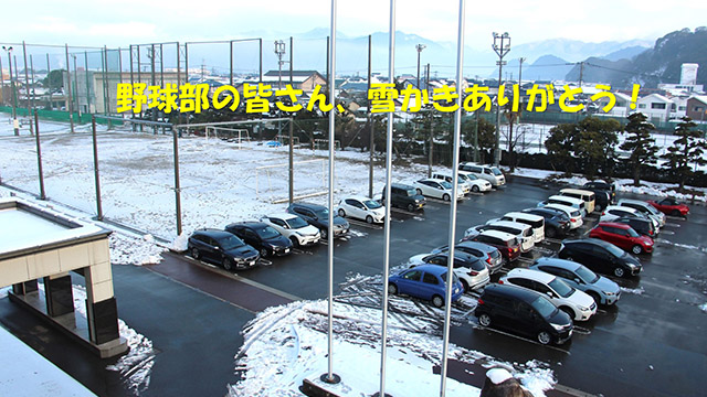 始業式の前日、学校の駐車場にはまだたくさんの雪が積もっていたそうです。そこで、部活動に来ていた野球部の皆さんが、駐車場の雪かきをしてくれたのこと。おかげで、始業式の日には雪が見事に無くなっていてスムーズな駐車が出来ました。野球部の皆さん、ありがとうございました!