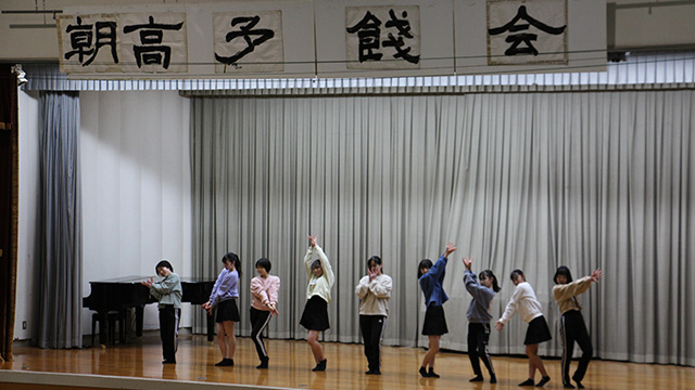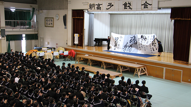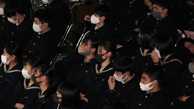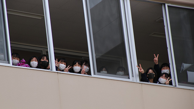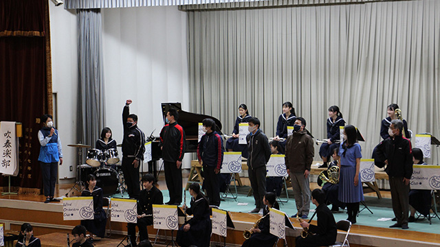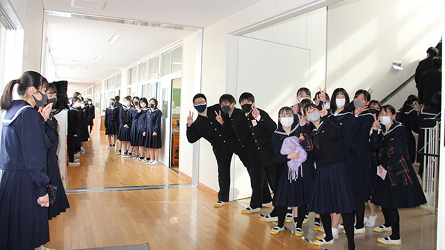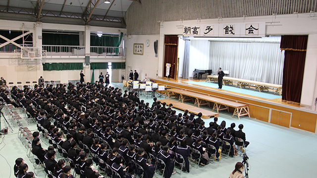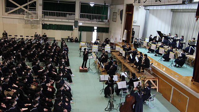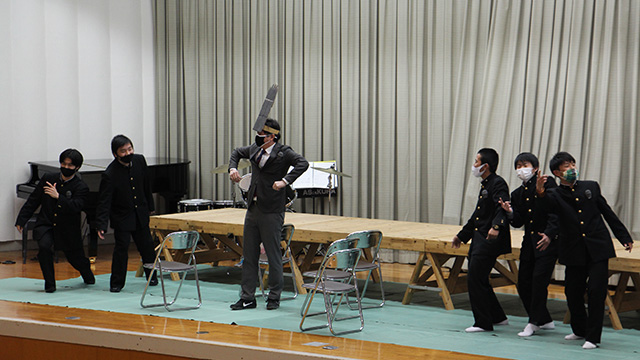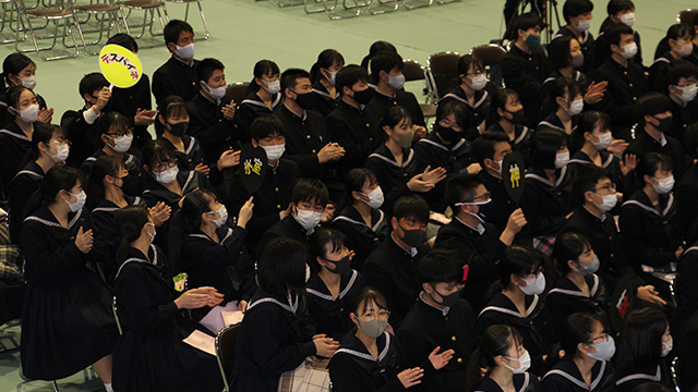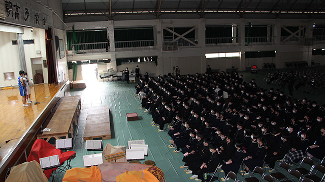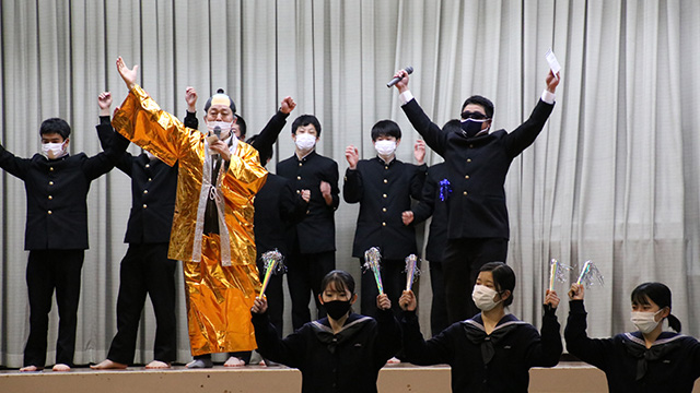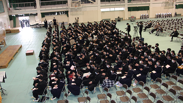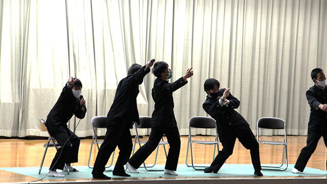 例年であれば、ピーポート甘木の大ホールで開催していましたが、今年は新型コロナウィルスの影響もあり本校体育館で行い、3年生は体育館、1・2年生は各教室へのリモート生配信で観覧する形を取りました。 簡略化での開催の中、有志の演目は工夫を凝らしたものばかりで、卒業していく3年生へ感謝の思いとエールがしっかりと詰まった予餞会となりました。 終了後は、1・2年生が学校のあちらこちらへ分散し「旅立ちの日に」を大合唱。学校中から歌声を届け、3年生の旅立ちを見送りました。