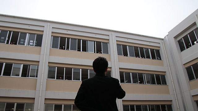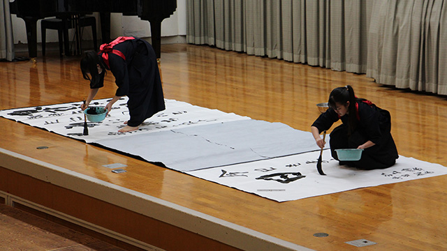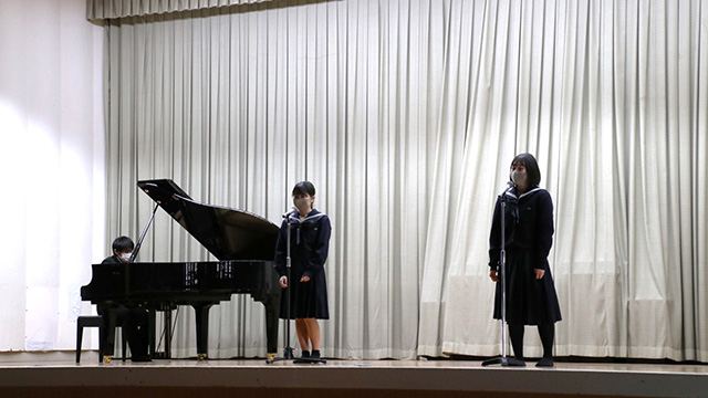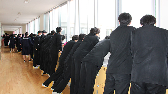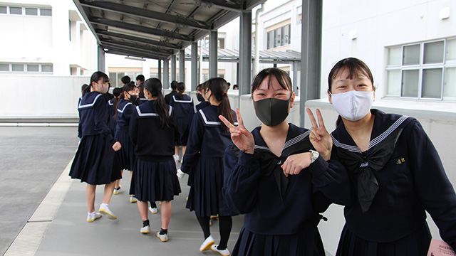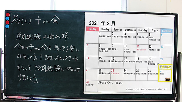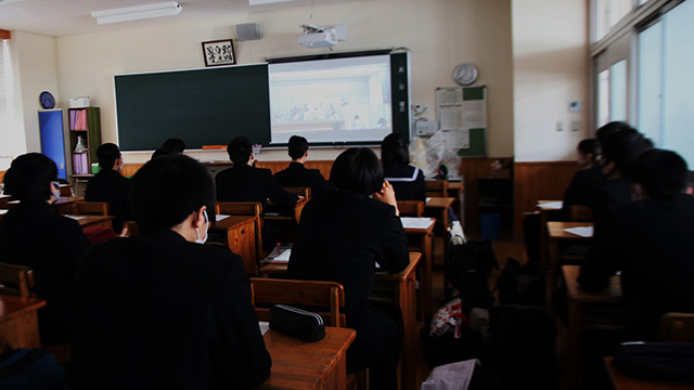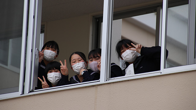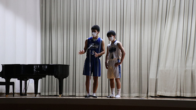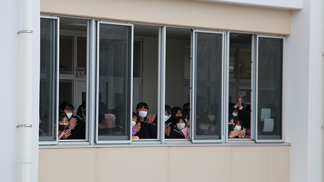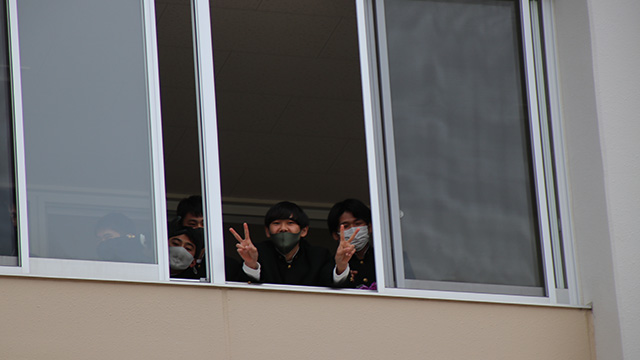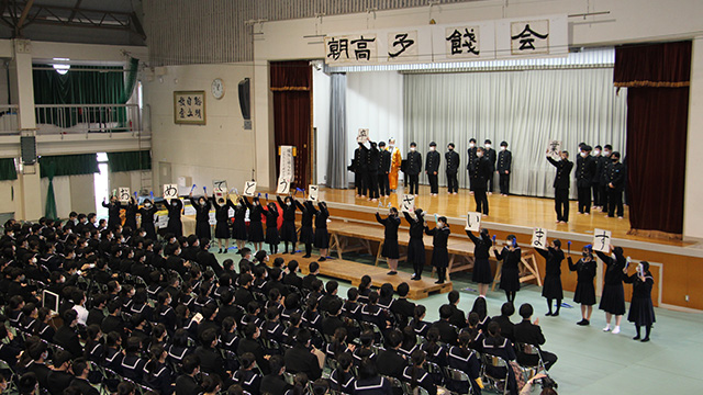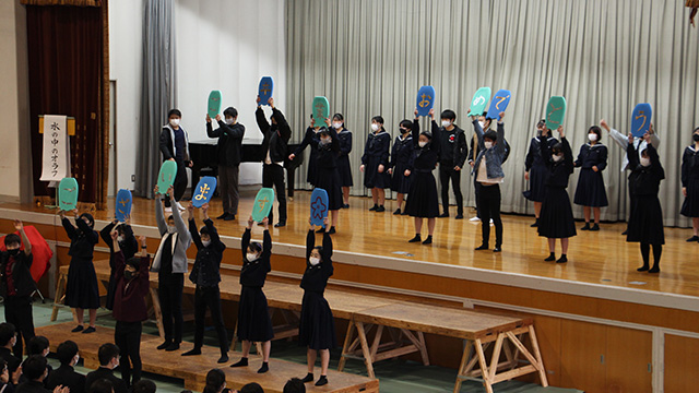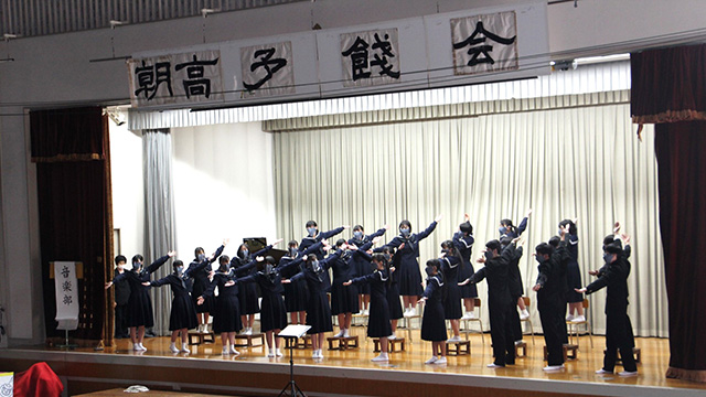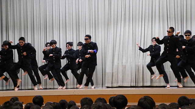 例年であれば、ピーポート甘木の大ホールで開催していましたが、今年は新型コロナウィルスの影響もあり本校体育館で行い、3年生は体育館、1・2年生は各教室へのリモート生配信で観覧する形を取りました。 簡略化での開催の中、有志の演目は工夫を凝らしたものばかりで、卒業していく3年生へ感謝の思いとエールがしっかりと詰まった予餞会となりました。 終了後は、1・2年生が学校のあちらこちらへ分散し「旅立ちの日に」を大合唱。学校中から歌声を届け、3年生の旅立ちを見送りました。