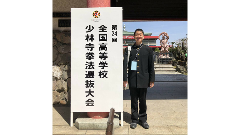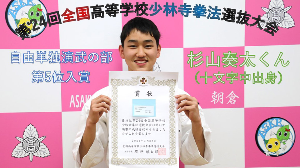 令和3年3月26日(金)〜28日(日)に善通寺市立体育館(香川県)で行われた第24回全国高等学校少林寺拳法選抜大会において、県大会・九州大会を勝ち抜き出場した本校2年杉山奏太くん(十文字中出身)が、男子自由単独演武の部で全国第5位という好成績を収めました。