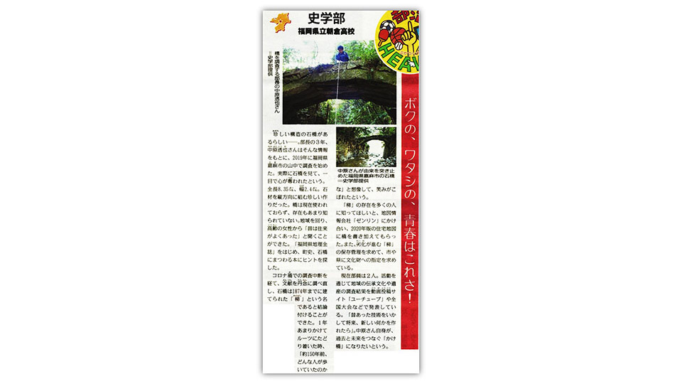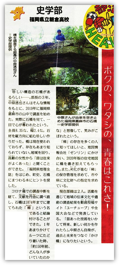 史学部です。 現在、5月上旬に発表予定の新しい調査研究に向けて準備を進めている段階ですが、最近、新聞掲載がありましたので紹介します。4月3日付の「毎日小学生新聞」で部活動に熱心に取り組む高校生ということで本校史学部が取材を受けて掲載されました。 多くの小学生に読まれて未来の史学部員が増えるとうれしいですね!