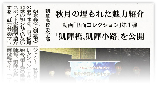 史学部の活動が毎日新聞の取材を受けました。今回は秋月の魅力再発見による地域探求です。まだまだ秋月には多くの歴史的魅力が眠っていると考え、その歴史を少しマニアックな視点で調査しています。 地道な活動で目立つようなものではありませんが、新しい発見や活動を目指して頑張っています。「B面コレクション」第2弾は夏ごろに発表する予定です。今後ともよろしくお願いします。