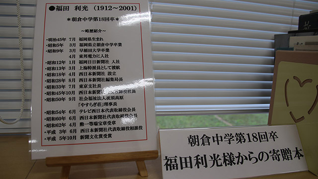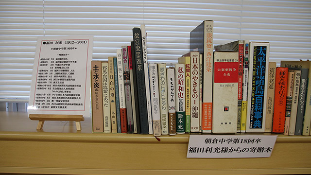 この度、朝倉中学第18回卒であり、西日本新聞社の代表取締役社長や本校同窓会会長を務められた福田利光様(2001年逝去)の御家族様より、利光氏所蔵の貴重な書籍・美術本を寄贈していただきました。 書籍に関しては「福岡県百科事典」や「北海道大百科事典」など、また美術本については田崎廣助氏の画集(限定版)や平山郁夫氏の素描集など非常に貴重なものをご寄贈いただきました。 貴重な書籍や美術本に触れる機会を通して生徒たちの見識が深まり、より充実した人格形成につながっていくことが期待されます。