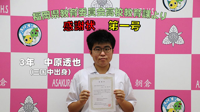 史学部に所属して活動を続けてきた3年中原透也さん(三国中出身)へ福岡県教育委員会高校教育課長より感謝状が贈られました。感謝状は今年度新たに設けた制度で中原さんが第1号となる快挙でした。彼が史学部で行ってきた調査研究の発表などが「県立高校に対する評価の向上に大きく貢献した」という点が表彰の理由でした。