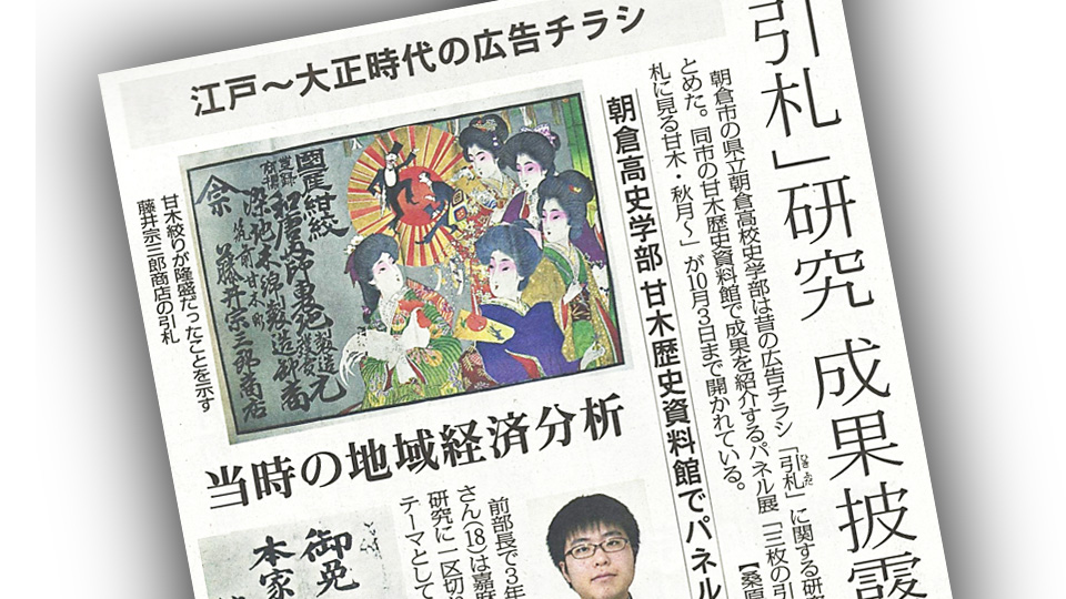 昔の広告(チラシ)である「引札」に関して、甘木・秋月地域における引札を調べていた史学部3年中原さん(三国中出身)の活動が新聞で紹介されました。 8月に予定していた発表会は新型コロナの影響で残念ながら中止となりましたが、パネル展は10月3日まで甘木歴史資料館にて開催されました。