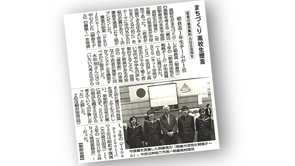 高校生が朝倉市の活性化に向けて提言を行う「第10回朝倉市の未来予想図 高校生の提言」発表会で市長賞を受賞した1年生チーム(1-2)の記事が毎日新聞に取り上げられました。本校からは2チームが出場し、発表の様子は下記よりご覧いただけます。