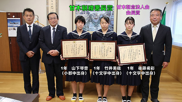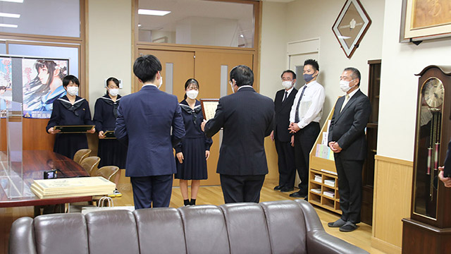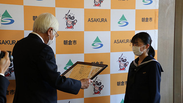 1学年地歴公民科の夏休みの課題として取り組んだ「令和3年度 税に関する高校生の作文募集」で本校から4名の生徒が優秀作品に選ばれ、朝倉市役所市長室及び本校校長室にて表彰式が行われました。