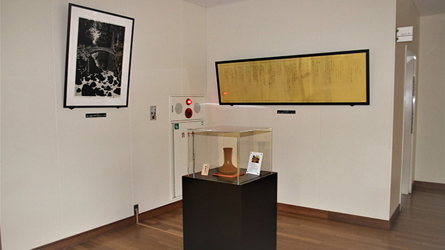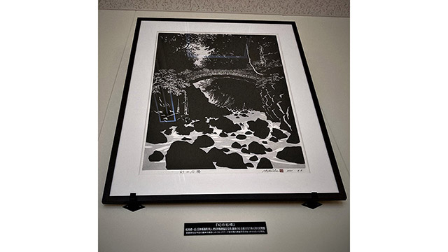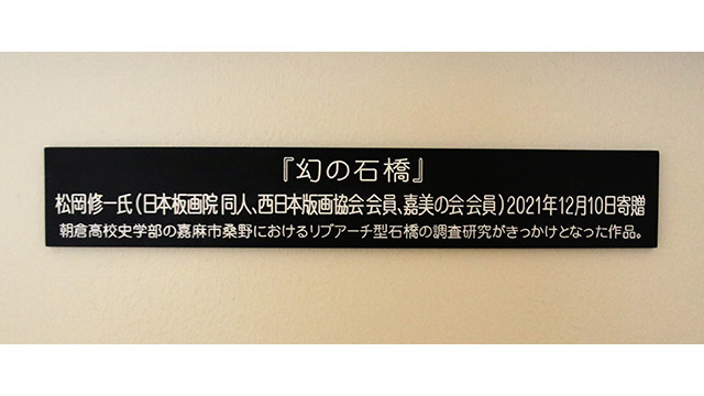 そのリブアーチ型石橋ですが、昨年12月に嘉麻市在住の地元版画家である松岡氏より見事な版画作品を寄贈していただきました。現在、校長室前に展示しており、在校生や来訪者の注目・関心を引いています。独特な形式であるリブアーチ型が版画として見事に表現された作品です。