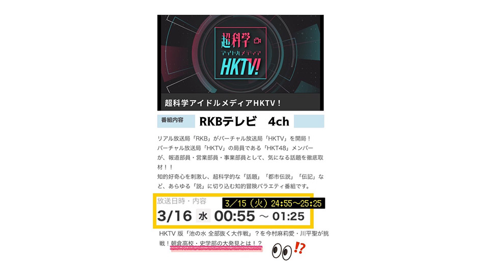 3月15日(火)の深夜24時55分からの番組『超科学アイドルメディアHKTV!』のコーナーで史学部の活動が紹介されます! 番組内の10分ほどだそうですが、HKT48の皆さんがどんな風に紹介してくださるのか楽しみです。 深夜になりますが、RKBテレビ(4チャンネル)、よろしければご覧ください。