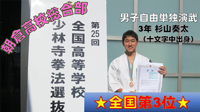 令和4年3月25日(金)~27日(日)、香川県善通寺市民体育館で行われた第25回全国高等学校少林寺拳法選抜大会に本校3年杉山奏太くん(十文字中出身)が出場しました。 男子自由単独演武の部で、全国第3位という素晴らしい成績をおさめました。 日々の修練の成果を存分に発揮した杉山くんの今後のさらなる活躍が期待されます。