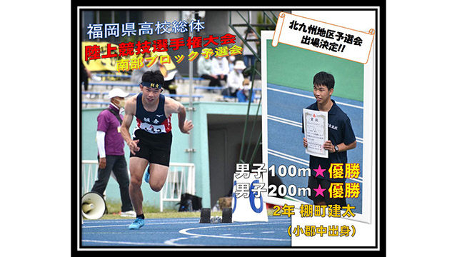 令和4年5月13日〜15日に久留米市総合スポーツセンターで行われた第75回全国高等学校陸上競技対校選手権大会福岡県南部ブロック予選会において、2年生の棚町建太くん(小郡中出身)が男子100mと男子200mの部で見事優勝し2冠を達成しました。陸上部は他にも13種目の競技で入賞を果たし、計10名の選手が県大会に出場しました。