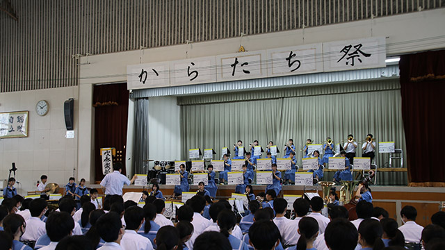 1日目は体育館での音楽部・吹奏楽部・文化部映像作品の発表が行われ、2日目は有志ステージとクラス企画、文化系部活動の様々な企画展示など、賑やかなからたち祭となりました。