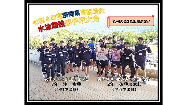 令和4年6月4日〜5日にグルーバルマーケットアクアパーク桃園で行われた福岡県高校総体水泳競技選手権大会(福岡県大会)において、3年生の渕歩夢さん(小郡中出身)と2年生の佐藤功太郎くん(浮羽中出身)の2名が上位入賞を果たし、九州大会への出場権を獲得しました。