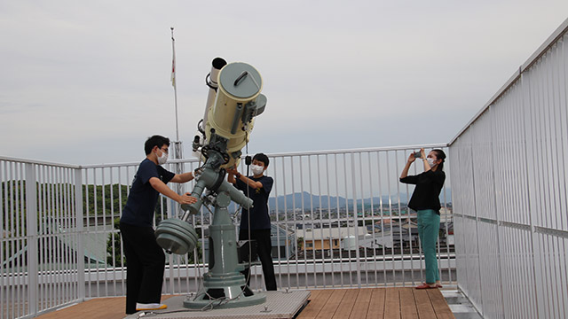 先日、夕方の情報番組『タダイマ』(RKB毎日放送)内のコーナー【カラフルハイスクール】の取材が本校にやってきました。 宇宙物理部の皆さんが部活動の様子や、屋上に設置してある大型反射望遠鏡を紹介してくれています。 放送日時は、RKBテレビ(4チャンネル)6月23日(木)18時55分前後の予定です。 是非、ご覧ください。