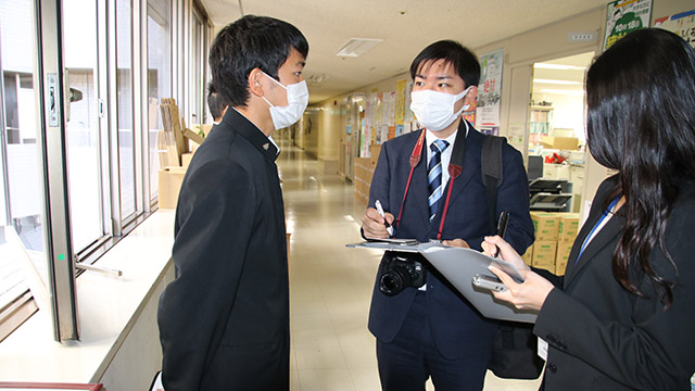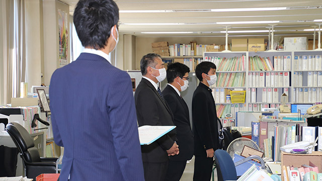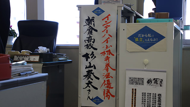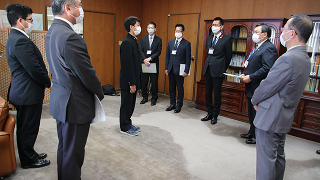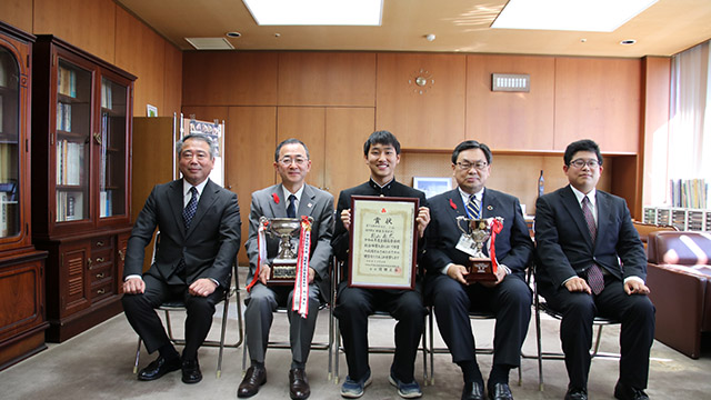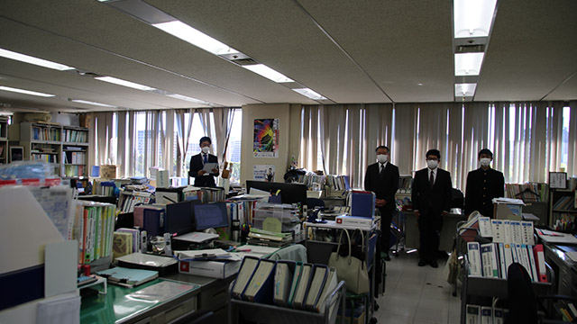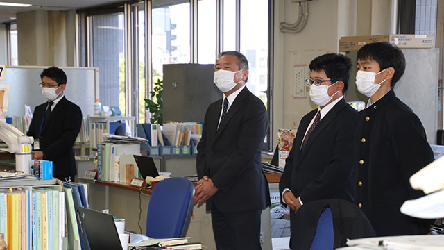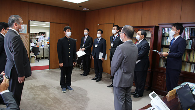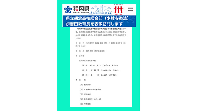 10月20日(木)、福岡県庁において、全国高校総体(インターハイ)少林寺拳法優勝の報告を行うため、吉田教育長を表敬訪問しました。 教育長室へご案内いただき、本校校長・部顧問・杉山奏太選手の挨拶後、吉田教育長並びに深瀬教育監よりお祝いのことばをいただきました。 その後、高校教育課、スポーツ健康課へ訪問し、同じく優勝報告を行いました。 今回の功績に各所で称賛の拍手をいただき、福岡県HPの記者発表資料にも掲載され、新聞社2社からの取材も受けました。お忙しい中、ありがとうございました。