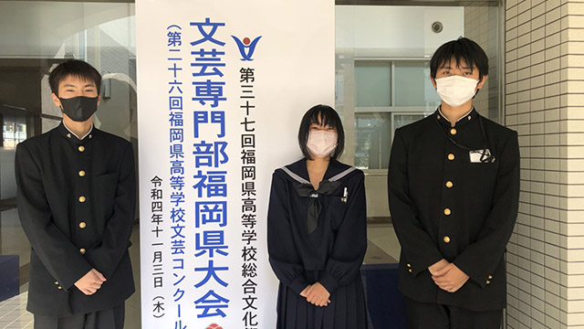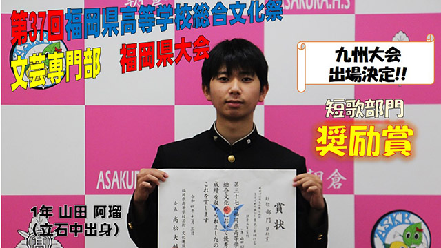 第37回福岡県高等学校総合文化祭の短歌部門において、本校文芸部1年山田阿瑠くん(立石中出身)が奨励賞を受賞し、来年度開催される九州大会への出場を決めました。文芸部の九州大会出場は10年振りの快挙です。
