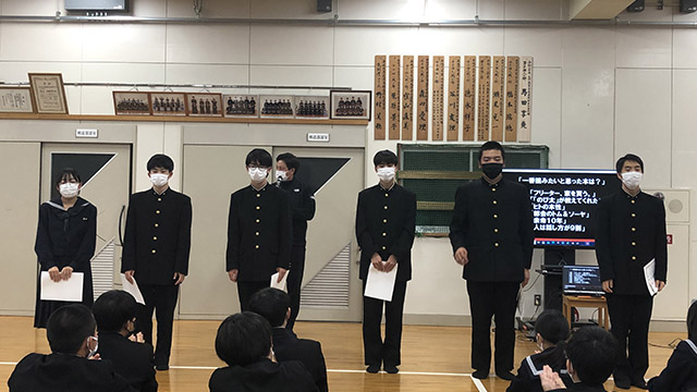 11月29日(火)、1.2年生を対象とした朝高ビブリオバトルの学年決勝が行われ、各学年のチャンプ本が決定しました。