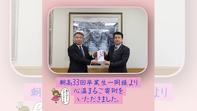 2月21日(火)、朝倉高校33回卒業生一同様より、心温まるご寄附をいただきました。 生徒たちのより良い教育環境の充実・本校のより一層の活性化のため、有効に使わせていただきます。 今後とも変わらぬご支援のほど、よろしくお願いいたします。