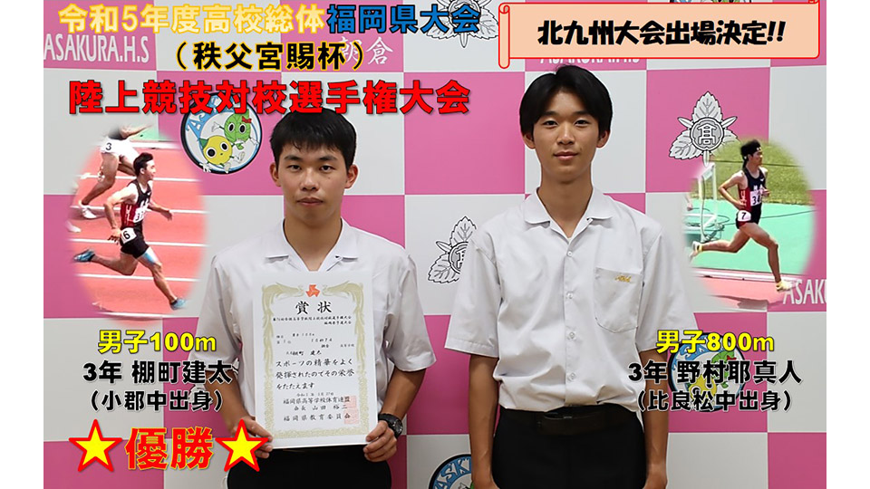 令和5年5月26日~28日に博多の森陸上競技上で行われた第76回全国高等学校陸上競技対校選手権大会福岡県大会において、3年生の棚町建太くん(小郡中出身)が男子100mの部で見事優勝し、福岡県No.1に輝きました。他に男子800mの部で、3年生の野村耶真人くん(比良松中出身)が第6位に入賞し、2名の選手が北九州地区予選大会の出場権を獲得しました。 北九州地区予選大会は、6月15日~18日の4日間にわたって、博多の森陸上競技上で開催されます。応援よろしくお願いします!