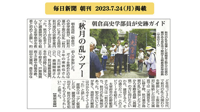 朝高史学部が案内人となって史跡探訪を行う『秋月の乱 史跡探訪ツアー』を7月23日(日)に開催しました。当日は定員を超える約40名の方が参加され、大変な盛況でした。 高校生による案内解説は新鮮で、参加者からも好評でした。機会があれば是非来年も企画したいツアーとなりました。 7月24日(月)の毎日新聞朝刊に、案内の様子を取り上げていただきました。