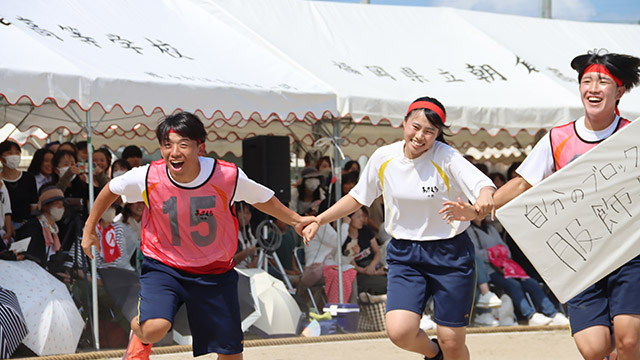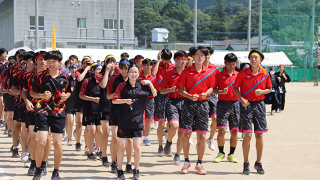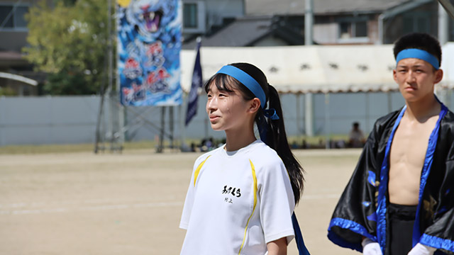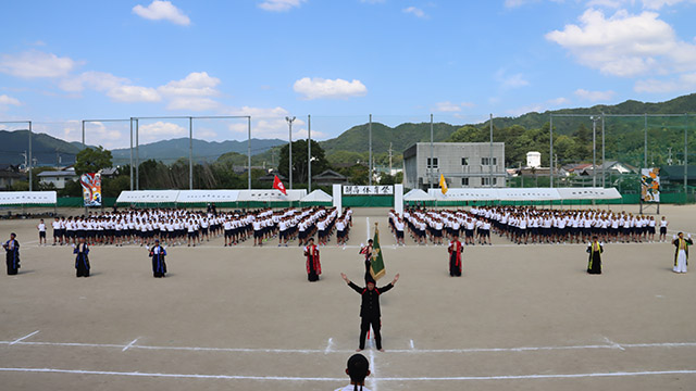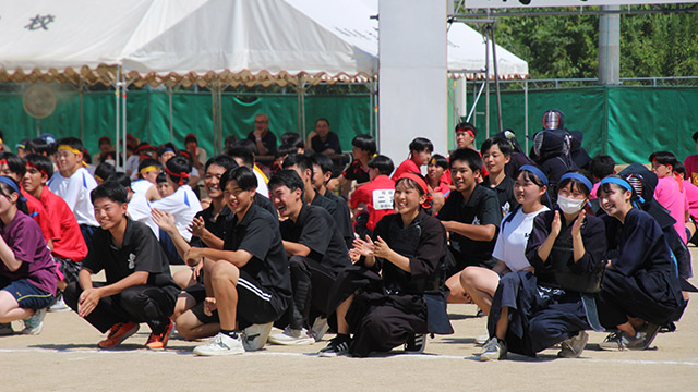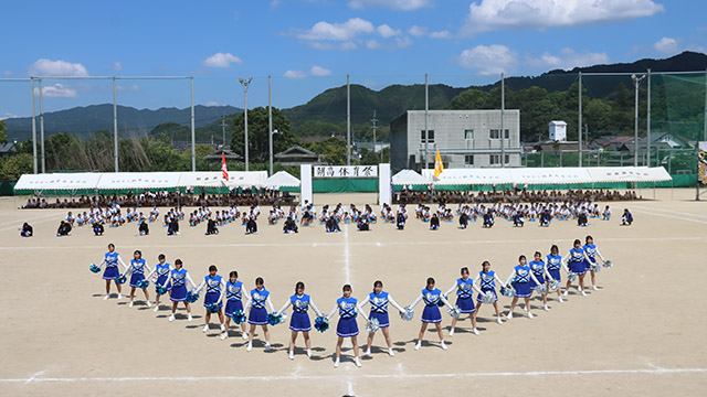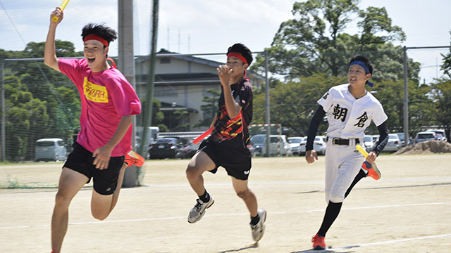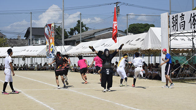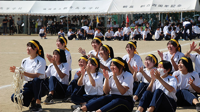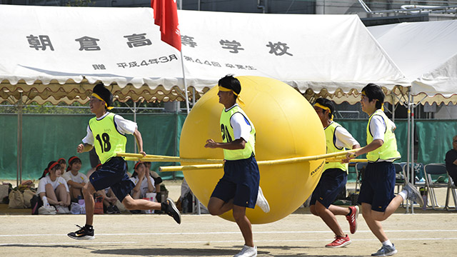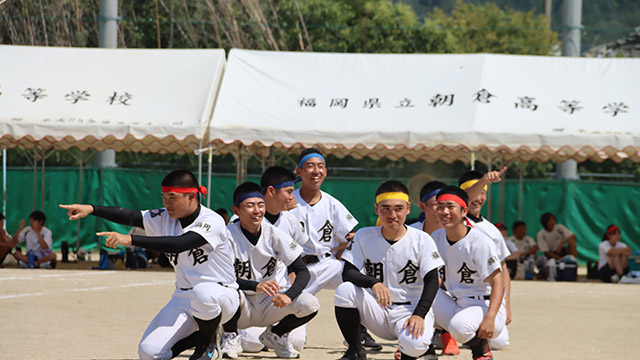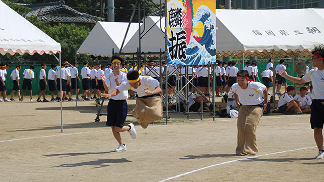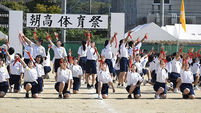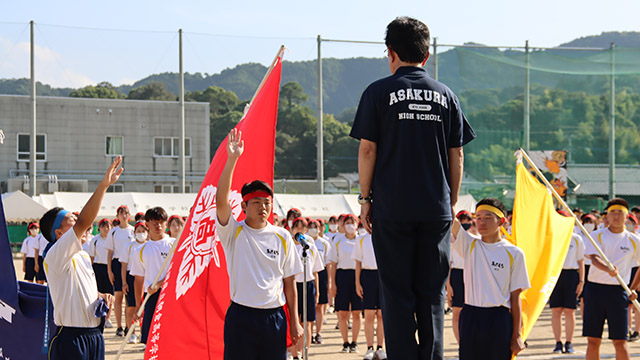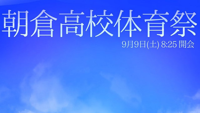 9月9日(土)、快晴のもと第66回朝高体育祭が開催されました。今年のスローガンには、一人ひとりが自分の長所を生かし未知の才能を開花させ、体育祭を通して頑張りや努力が輝けるようなものにしていきたい、これからの朝倉高校を新しく作っていきたい、という実行委員の想いから『一閃』と『爛漫』という言葉を組み合わせて設定されました。