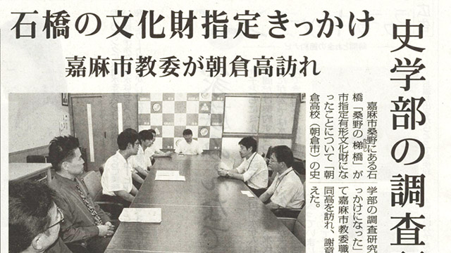 発表会で主張していたことが本当に実現して大変うれしいニュースとなりました。全国的に見ても高校の部活動から文化財指定まで到達することは非常に珍しいということで、価値ある活動の記録となりました。新聞の記事はそれを受けて嘉麻市教育委員会職員が表敬訪問として来校された際のものです。現在の部員たちと歓談して有意義な時間となりました。