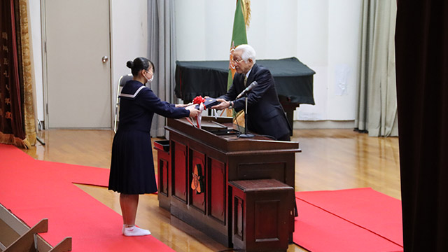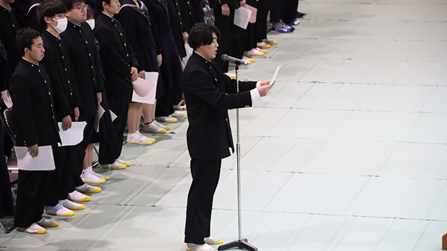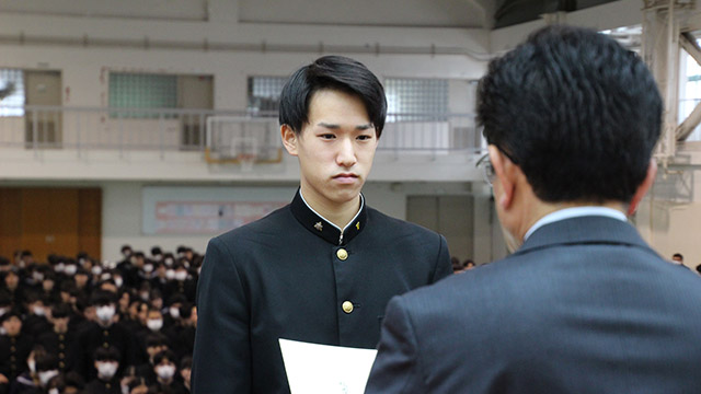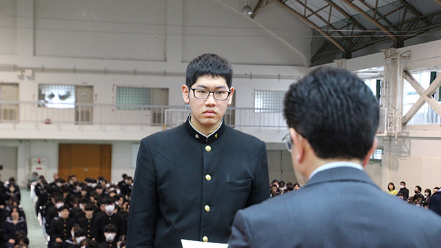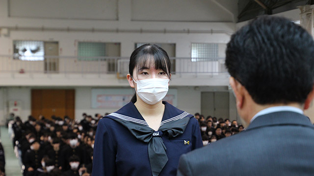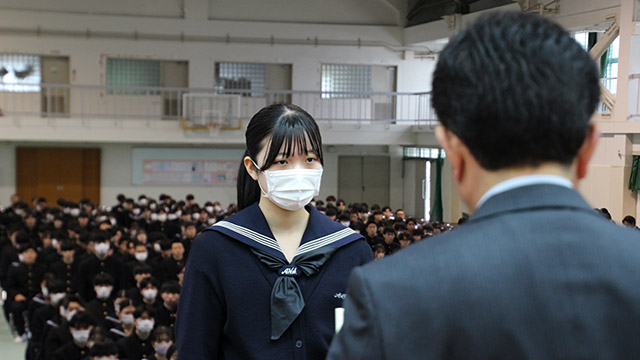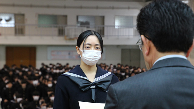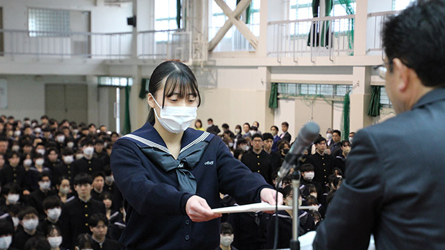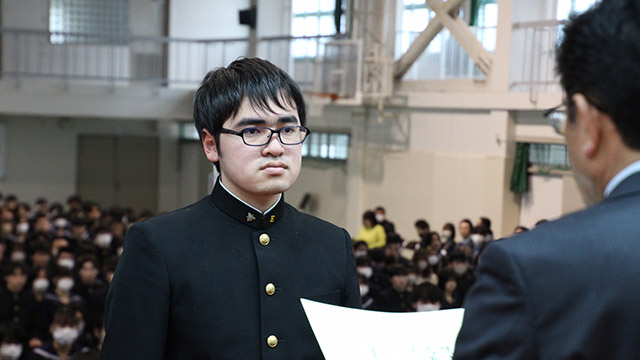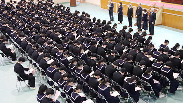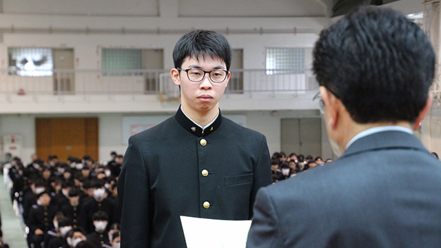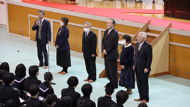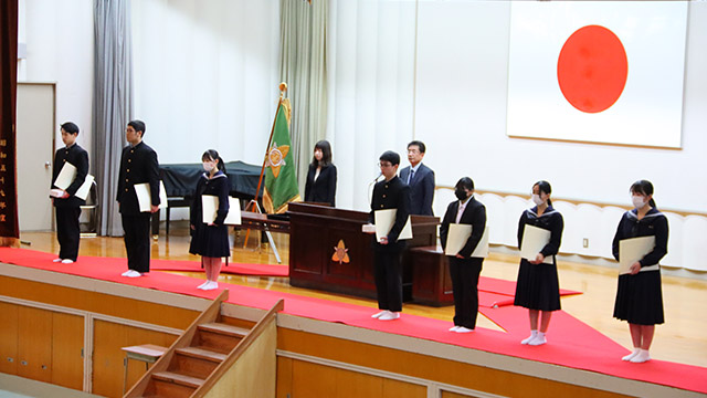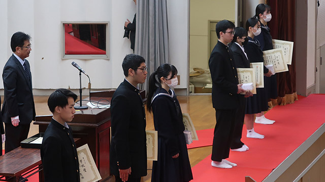 令和6年2月29日(木)、令和5年度表彰式・同窓会入会式が行われました。 ■1ヶ年皆勤賞 59名 ■3ヶ年皆勤賞 43名 ■学業成績部門 2名 ■部活動部門 陸上個人1名・音楽部・史学部 ■特別功労部門 1名 の皆さんが表彰を受けました。 同窓会入会式では、第76回生として朝倉同窓会の一員となりました。