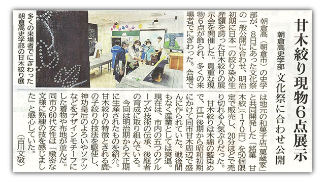 6月8日(土)に一般公開となった朝高文化祭(からたち祭)で、史学部は現存する貴重な「甘木絞り」の展示会を行いました。 全部で6点の展示でしたが、全て明治~大正期にかけての貴重な絞りばかりで多くの方が来場、見学されていました!会場で限定販売した「銘菓 甘木絞」も用意した50個がわずか20分で売り切れるなど大盛況の展示会となり、生徒も充実した様子で無事に終了することができました。