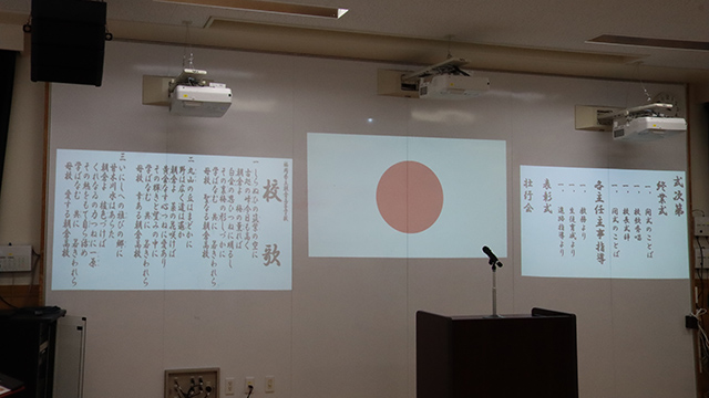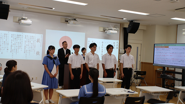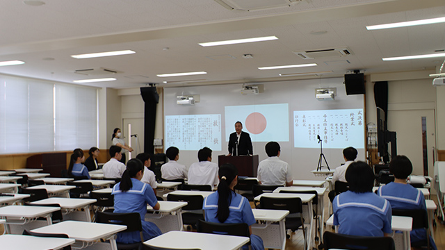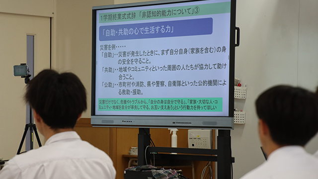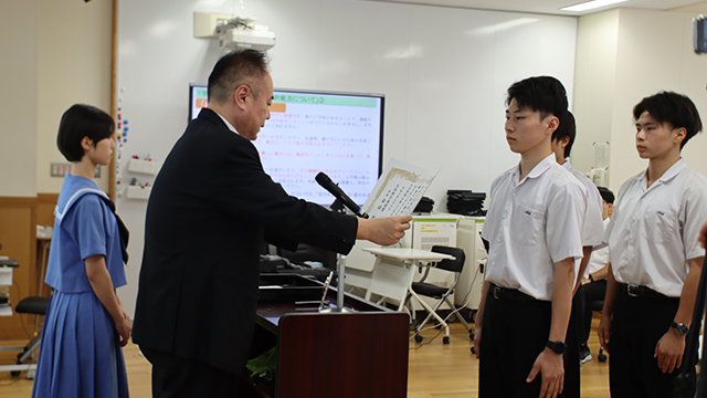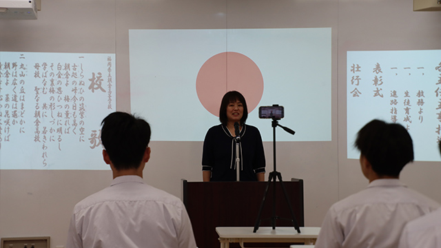 連日の猛暑での熱中症対策として、今回の終業式はリモートにて配信し、校長式辞・各主任主事講話等を教室で視聴しました。