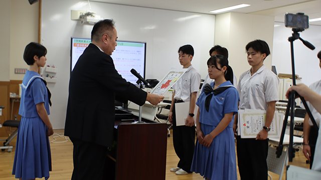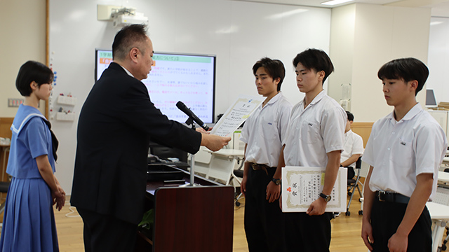 表彰式では九州大会6位入賞の弓道部3年中村拓真さん(三輪中出身)、北部九州大会優勝の陸上部3年福永実由さん(立石中出身)、県大会3位入賞の水泳部3年石橋悠さん(浮羽中出身)、3年廣底尚人さん(浮羽中出身)、子川万椰斗さん(甘木中出身)、後藤琢己さん(甘木中出身)、の表彰が行われ、校長先生より一人一人に賞状が手渡されました。