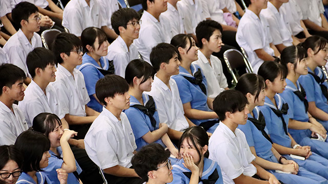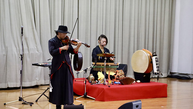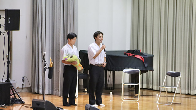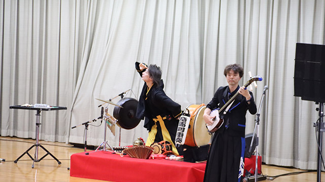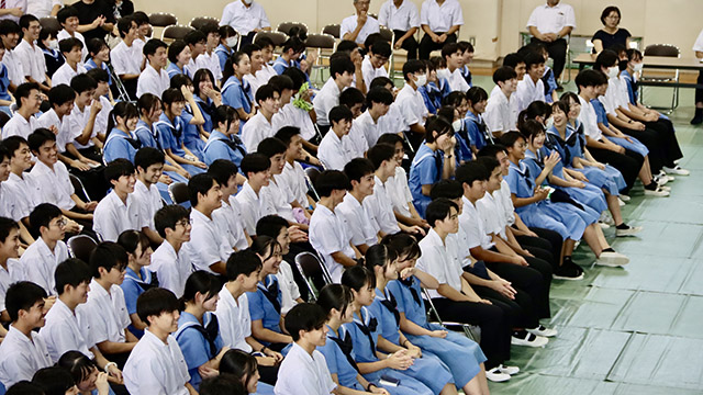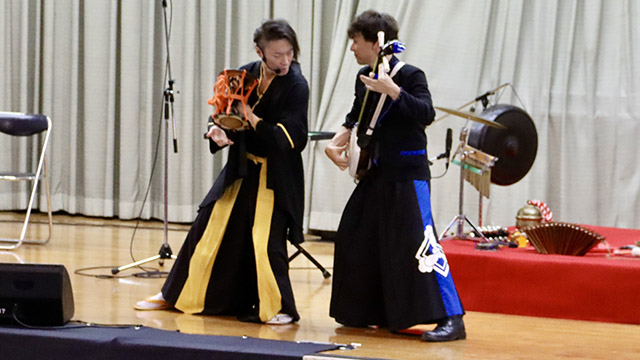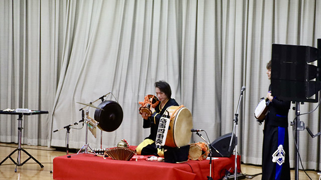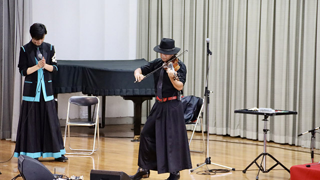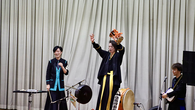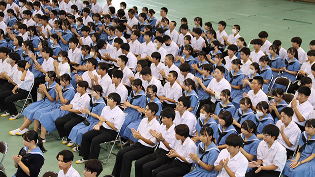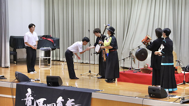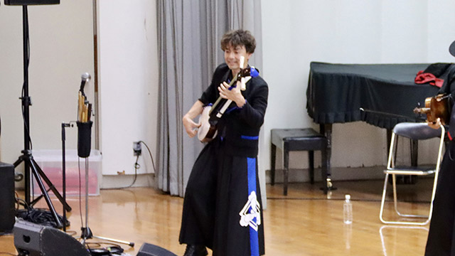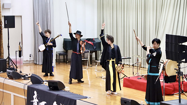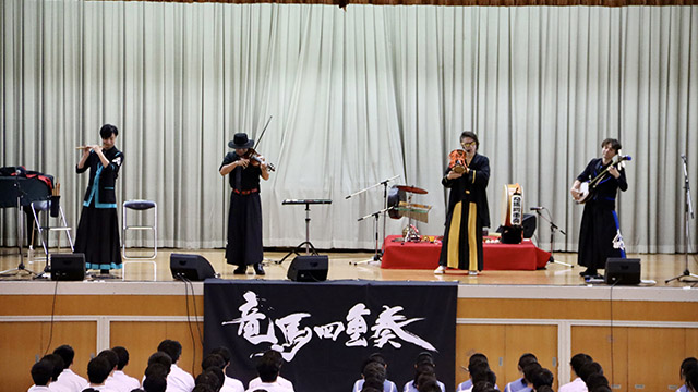 令和6年10月18日(金)、本校体育館において令和6年度芸術鑑賞会が実施されました。 全国各地をツアーで回り、個々でも精力的に活動されている『竜馬四重奏』の皆さんにおいでいただきました。前日は、博多でLIVEをされたあとの朝倉高校訪問で、舞台は小さな体育館ステージでありながらも、LIVEさながらの演奏を聴かせていただき、生徒も大興奮の芸術鑑賞会となりました。