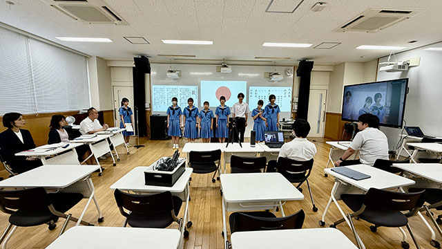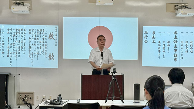 7月18日(金)、1学期終業式と表彰式・壮行会が行われました。連日の猛暑続きのため、会議室よりリモート配信で実施しました。 表彰式では、水泳部の九州大会の栄誉を讃え、壮行会では九州大会に出場する陸上部、全国高校総文祭に出場する音楽部へエールが送られました。