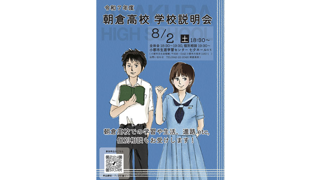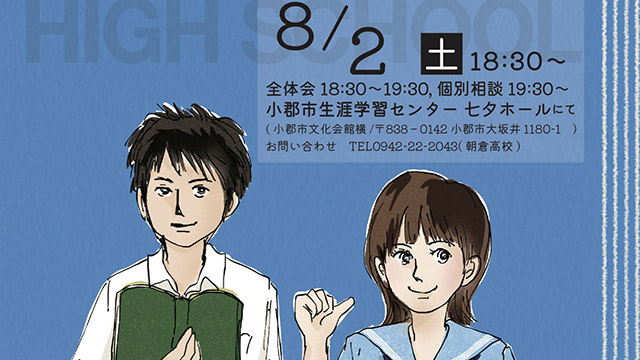 8月2日(土)夕方18:30より、小郡市生涯学習センター 七夕ホールにて小郡学区対象の朝倉高校学校説明会を行います。