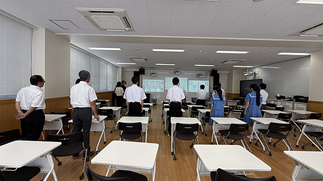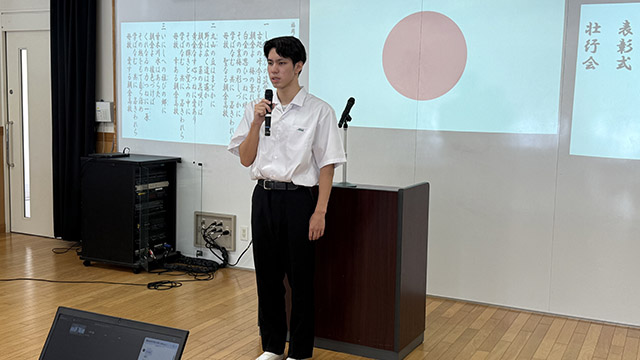 8月22日(金)、残暑厳しい中での2学期スタートとなり、今回も会議室よりリモートで始業式を行いました。 校長式辞では、信頼できる人への相談の大切さや、体育祭に向けての準備・チャレンジ・他者との協力、学習面でも大切な2学期であるとして、文武両道を期待していることを伝えられました。 表彰式では、九州大会で見事な成績を残し、インターハイへ出場した選手へ賞状が手渡されました。また、この結果を受け、9月に滋賀県で行われる国民スポーツ大会へ福岡県代表としての出場が決定しています。