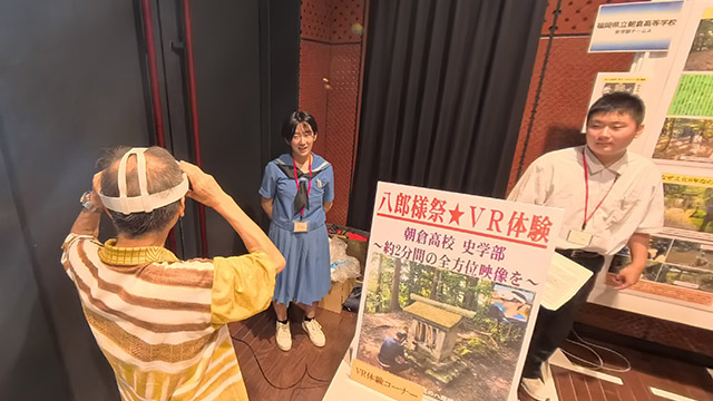 8月2日(土)には九州国立博物館で開催された「全国高等学校歴史学フォーラム2025」に出場しました。これは、一次審査を突破した高校が出場する全国大会です。今年は、30校近くが応募し9校が出場しましたが、朝倉高校史学部は昨年に続き唯一の2チーム出場を果たしました。チームAは、数年来調査研究をしている嘉麻市馬見地区における為朝研究の最新成果を、チームBは1年生チームで、高校近くの甘木公園で見つけた謎のレンガアーチ建築物についての調査結果を報告しました。チームAは、調査地域の様子が詳しくわかるように、今回はじめてVR機器活用による360度動画を導入し、会場で多くの方に体験していただき、好評価をいただきました。特に、高齢の方々は大きな驚きを持って見入る方も多く、VR活用による「わかりやすく新しい地域探究」の実践に成果を感じることができました。九州国立博物館での発表は前日の1日(金)に西日本新聞の朝刊で大きく取り上げられたため、新聞記事を見て興味を持ち来てくださる方や、「毎年史学部の発表を楽しみに来ているのよ」と言われる卒業生の方もお見えになり、気の引き締まる思いでした。