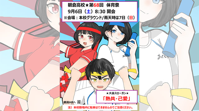 日時:9月6日(土) 8:30開会式 場所:朝倉高校グラウンド たくさんのご来場お待ちしております。 (保護者・一般の方も観覧いただけます) なお、本校には駐車場がごさいませんので、自家用車での来校はご遠慮いただきますようお願いいたします。 開場は7時30分となっております。 開場時間前の場所取りや、学校周辺の私有地、病院・商業施設への無断駐車は固くお控えいただきますようお願いいたします。