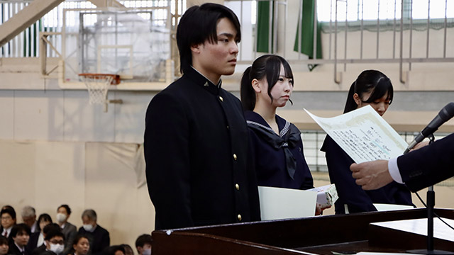 同窓会入会式では、卒業記念品として卒業証書フォルダーを贈呈していただき、第78回卒業生として朝倉同窓会の一員となりました。