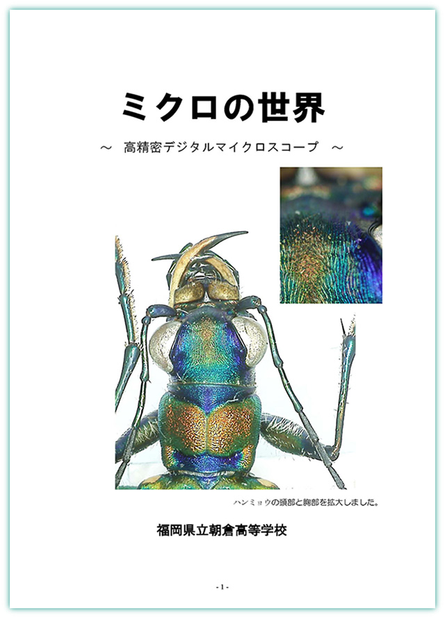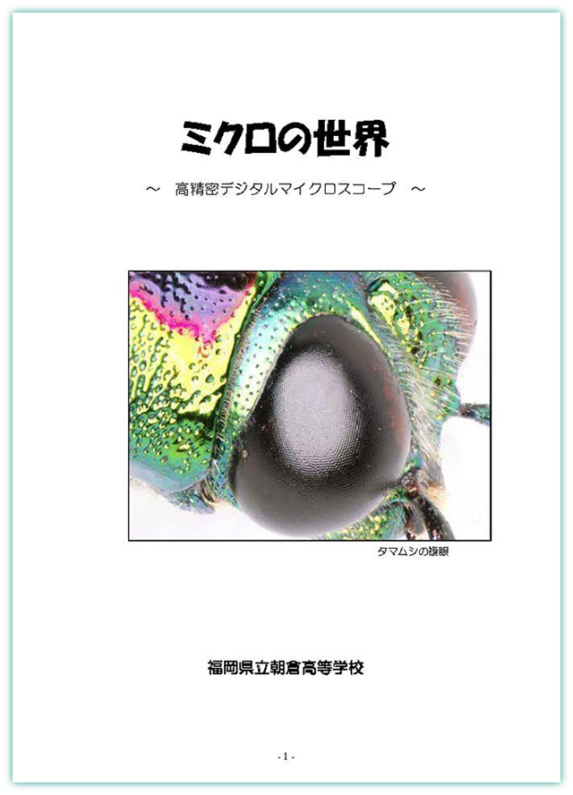 The Micro world [2011] CONTENTScover : ハンミョウの頭部と胸部の拡大画像いろいろな計測と画像 ・ タマネギ表皮細胞の表面計測 ・ 硫酸銅の結晶(角度計測) ・ パン作り用の酵母菌の個体数のカウント ・ ネジの3D画像 ・ ツツジの葯と花粉 ・ スイゼンジノリ ・ ギラファノコギリクワガタのむ口器 ・ ハンカチの表面 ・ ユスリカの唾液腺染色体 生物部の生徒が撮影したプランクトン ・ アンキストロデスムス(緑色植物門 緑藻綱) ・ ツボワムシ(輪形動物門 ワムシ綱) ・ イカダモ(緑色植物門 緑藻綱) ・ フナガタケイソウの仲間に囲まれたイカダモ 昆虫の美しい姿 ・ アシナガコガネの体表 ・ スルコウスキーモルフォ(モルフォチョウの仲間) PDF-file |