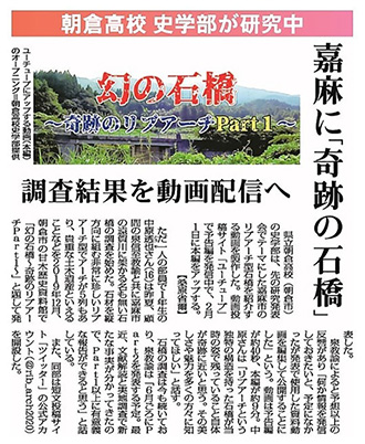 本校史学部が調査研究を行っている嘉麻市桑野にあるリブアーチ型石橋ですが、これまでいくつものテレビや新聞でも報道され、大きな話題と関心を呼んできました。